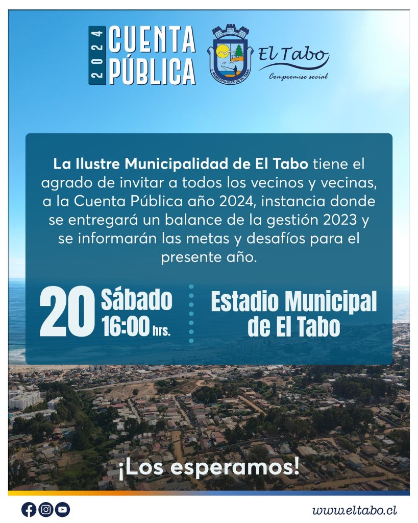 Nos es muy grato invitar a ustedes a la Cuenta Pública gestión 2023, en donde nuestro Alcalde entregará detalles de su administración, además de las iniciativas y proyectos contemplados para el resto del presente año.
