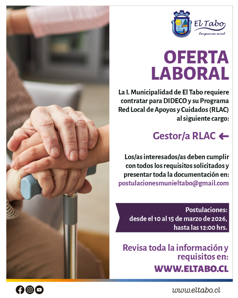 La Municipalidad de El Tabo informa la apertura de proceso de selección para el cargo de Orientador/a Laboral, para desempeñarse en OMIL, bajo modalidad a honorarios, con jornada de 30 horas semanales, desde mayo a diciembre de 2026. 🗓️ Postulaciones: desde el 09 al 15 de abril💻 Vía exclusiva: a través de la plataforma BNE🔗 […]