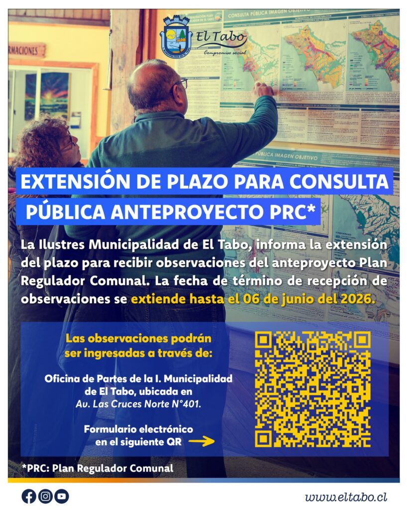 Se informa a la comunidad que se ha extendido el plazo para realizar observaciones al Anteproyecto del Plan Regulador Comunal hasta el 6 de junio Las observaciones pueden ser ingresadas a través de la Oficina de Partes en el municipio o de forma online escaneando el código QR disponible en la imagen de esta publicación […]