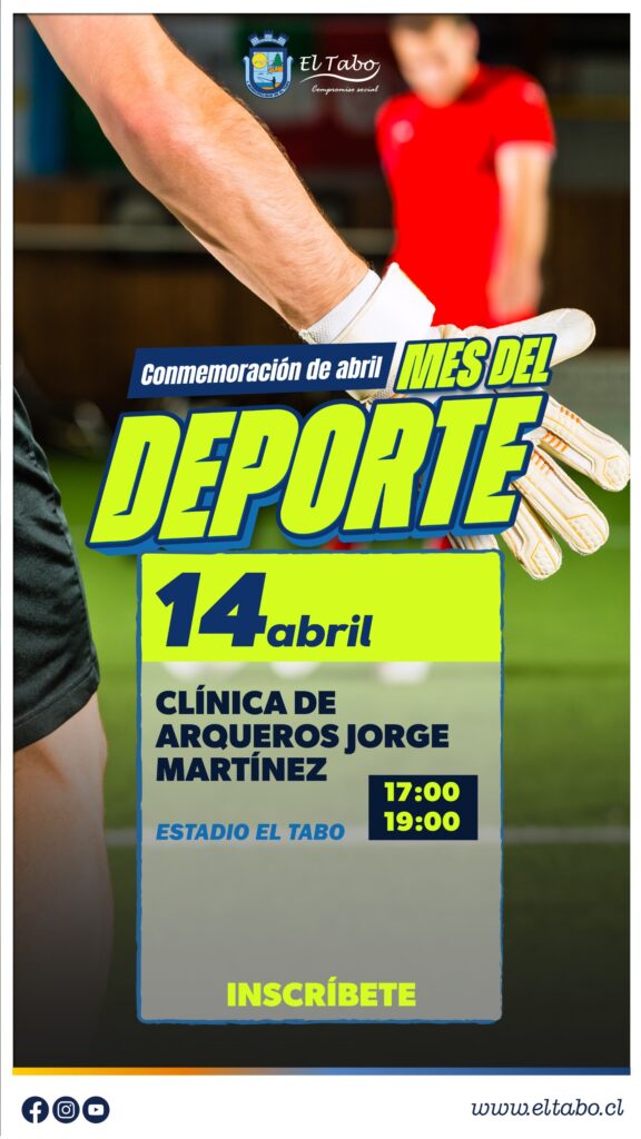 Martes 14 de abril de 17:00 a 19:00 hrs. Ven al Estadio El Tabo y perfecciona tus habilidades como portero, junto al destacado preparador de arqueros Jorge Martínez, quien formó parte del cuerpo ténico del primer equipo de Colo Colo.