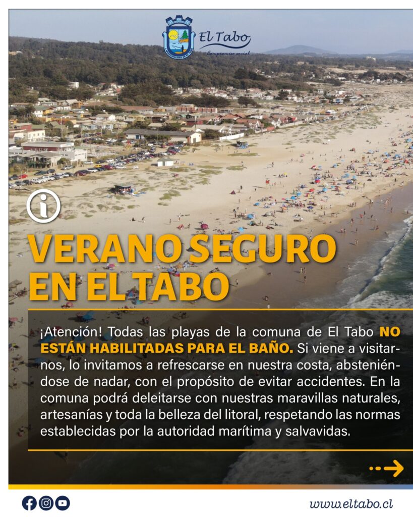 En el inicio de la temporada de verano, y según información entregada por la Armada de Chile, la Municipalidad de El Tabo informa a la comunidad y a quienes visitan la comuna que actualmente no existen playas autorizadas para el baño en el territorio comunal. Esta medida responde a evaluaciones técnicas realizadas por la autoridad […]