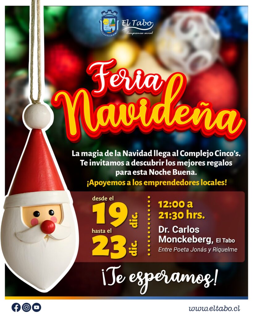 La Municipalidad de El Tabo extiende una cordial invitación a vecinas, vecinos y visitantes a participar en la Gran Feria Navideña 2025, una instancia pensada para celebrar estas fiestas en un ambiente familiar, lleno de colores, alegría y espíritu navideño. La actividad se desarrollará en el Complejo Cinco’s, desde el viernes 19 hasta el martes […]