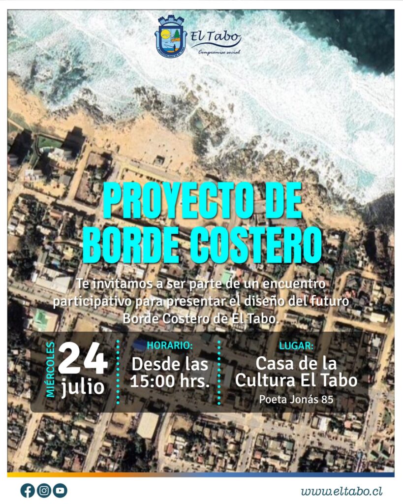 ¡Atención, vecinas y vecinos de El Tabo! Quedan cordialmente invitados a un encuentro participativo en donde se dará a conocer el diseño del Borde Costero frente al Complejo Cinco´s de El Tabo. La cita es este miércoles 24 de julio a partir de las 15:30 horas en la Casa de la Cultura El Tabo ubicada en […]
