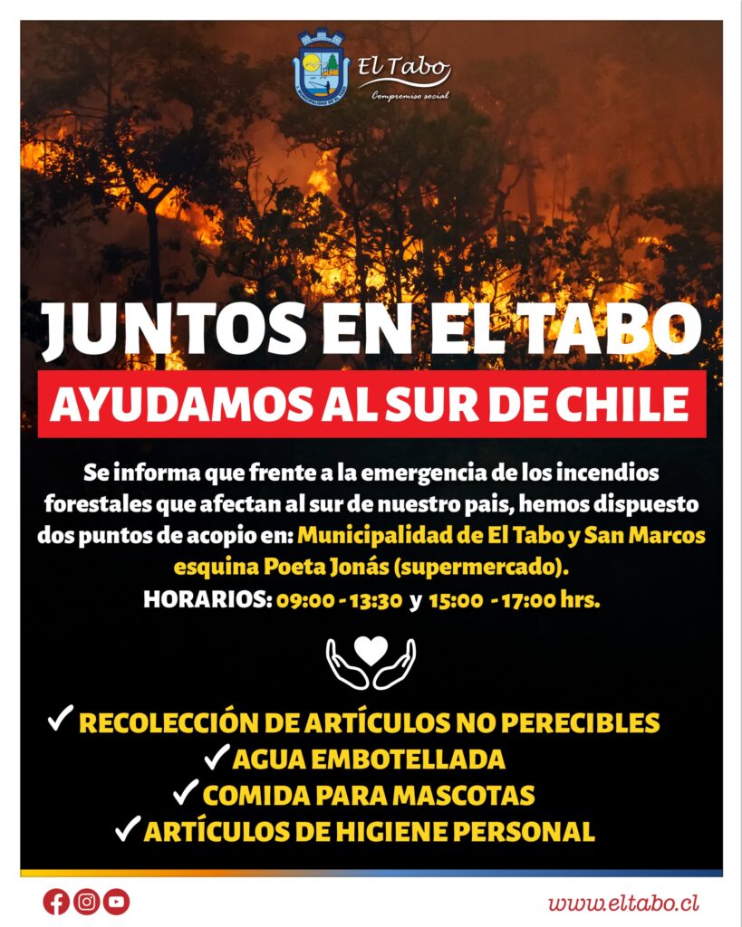 La Municipalidad de El Tabo dará inicio hoy lunes 19 de enero a partir de las 15:00 horas a una campaña de ayuda solidaria destinada a apoyar a las comunas del sur del país afectadas por los incendios forestales. La recolección de aportes se realizará en dos puntos habilitados en el territorio comunal: Desde el […]
