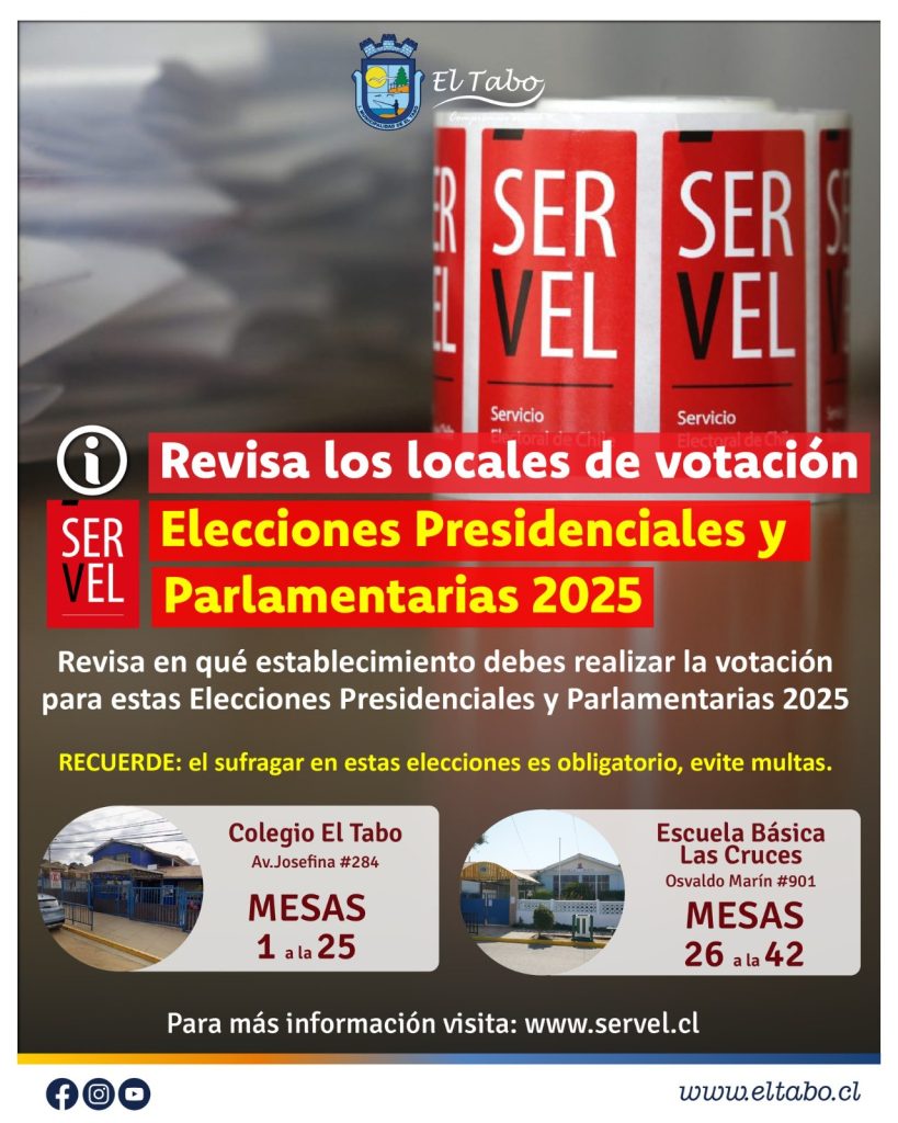 La Municipalidad de El Tabo informa a la comunidad que los dos locales de votación habilitados en nuestra comuna serán: Colegio El Tabo: 1 a la 25 Escuela Básica Las Cruces: Mesas 26 a la 42 Antes de asistir, verifica tu mesa y local de votación en www.servel.cl Recuerda que votar en esta elección es […]