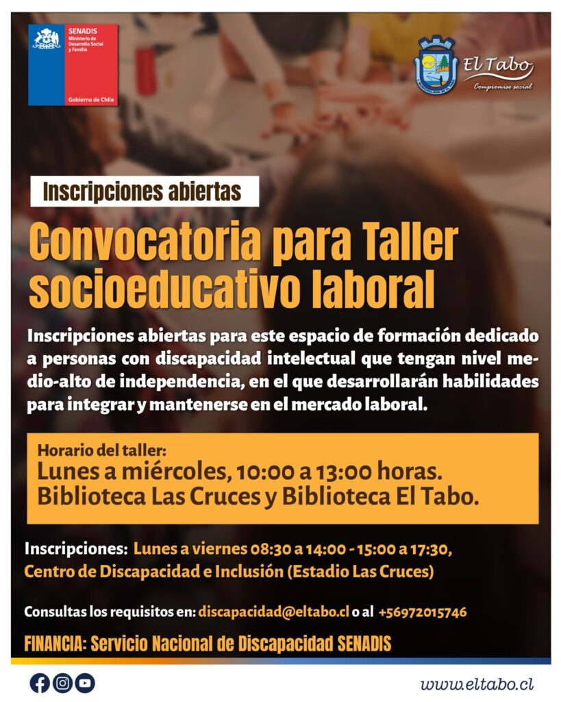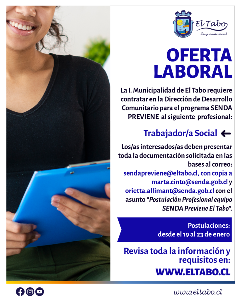 ✅👉𝗢𝗽𝗼𝗿𝘁𝘂𝗻𝗶𝗱𝗮𝗱 𝗟𝗮𝗯𝗼𝗿𝗮𝗹:La Dirección de Desarrollo Comunitario requiere contratar para el programa SENDA Previene un trabajador/a social.El periodo de postulación se extenderá desde el 19 al 23 de enero del presente año.👉Conoce los requisitos y bases de postulación en la web eltabo.cl. Las personas interesadas que cumplan con los requisitos deben enviar sus antecedentes al correo […]