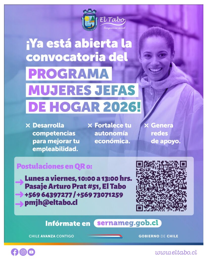 Desde el lunes 19 de enero y hasta el 20 de marzo, estará abierto el proceso de postulación para el Programa Mujeres Jefas de Hogar de la comuna El Tabo. Esta instancia tiene como objetivo fortalecer la autonomía económica, potenciar habilidades y acompañar a las participantes en su desarrollo personal y apoyarlas para abrir nuevos […]