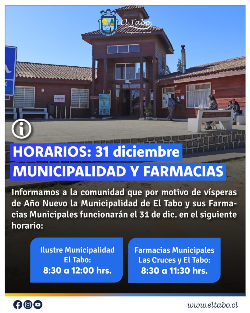 En el marco de las celebraciones de Año Nuevo, la Ilustre Municipalidad de El Tabo informa a vecinos y vecinas que este miércoles 31 de diciembre la atención a público se realizará en horarios especiales, considerando ajustes tanto en el municipio como en las farmacias municipales.👉Horario de atención del municipio: de 8:30 a 12:00 hrs.👉Horario […]