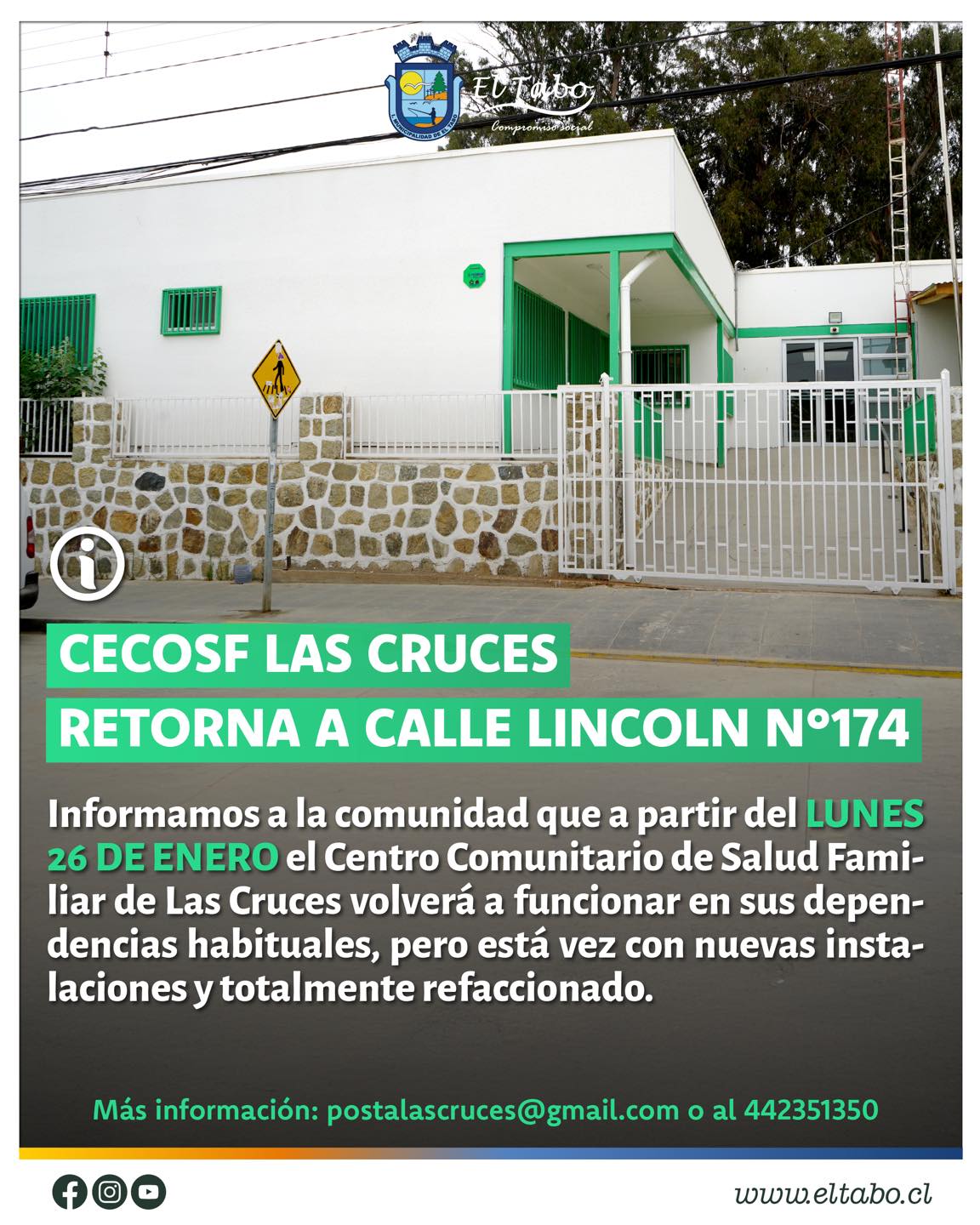 Desde el lunes 26 de enero, el Centro Comunitario de Salud Familiar de Las Cruces retoma su atención en calle Lincoln N°174, en un espacio renovado y pensado para la comunidad.