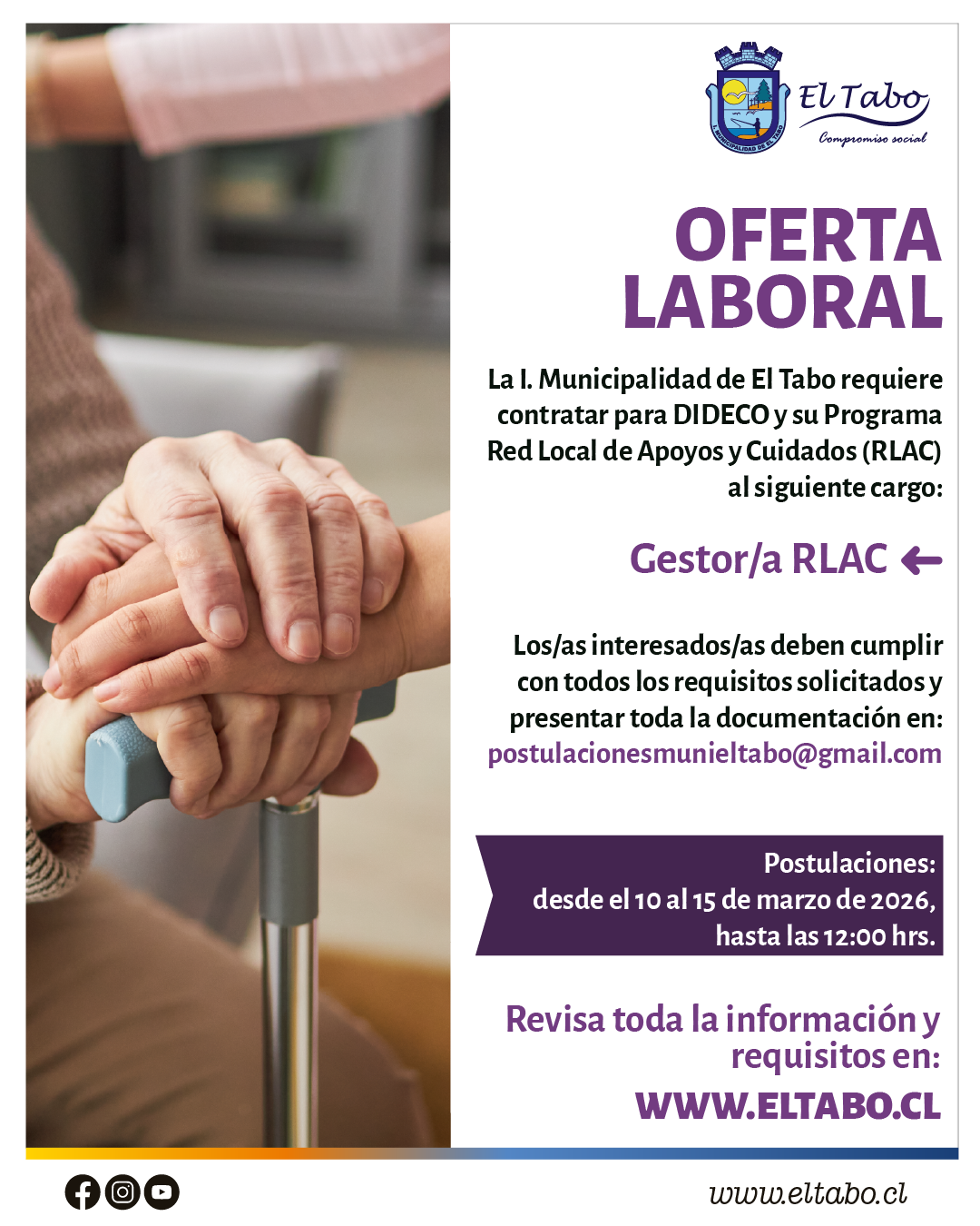 Las personas interesadas deben enviar los antecedentes que se solicitan al siguiente correo electrónico: postulacionesmunieltabo@gmail.com, indicando en el asunto: postulación a cargo gestor, Programa Red Local de Apoyos y Cuidados El Tabo.