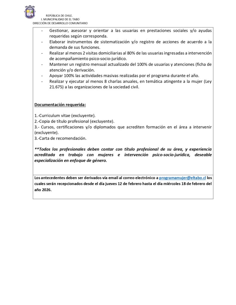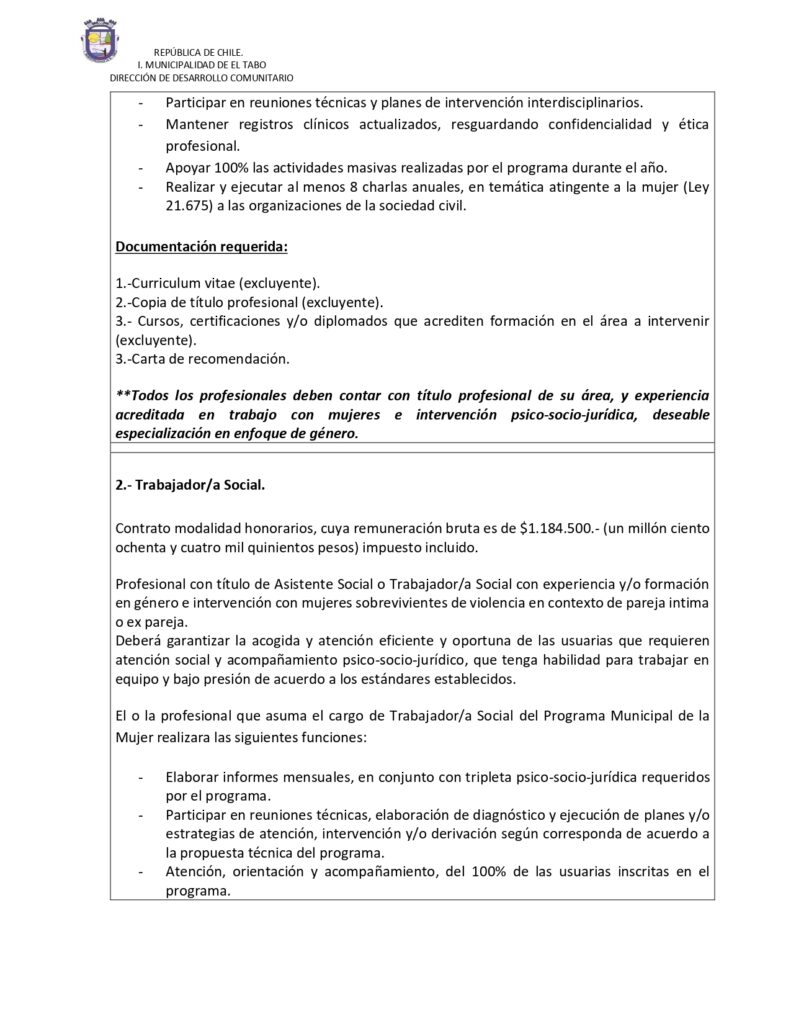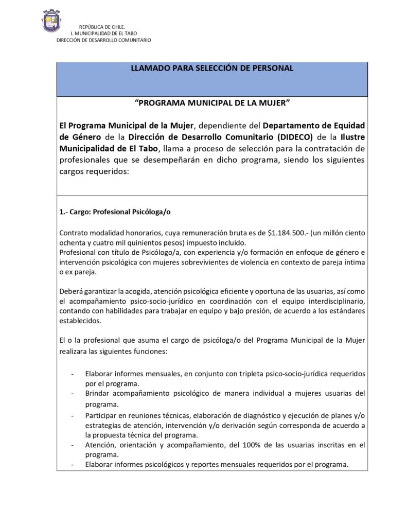 Se requiere proveer el cargo de profesional psicologo/a y trabajador/a social para el programa municipal de la mujer, dependiente del Departamento de Equidad de Género, para la entrega de acompañamiento e intervención psico – social a mujeres mayores de 18 años pertenecientes a la comuna de El Tabo.