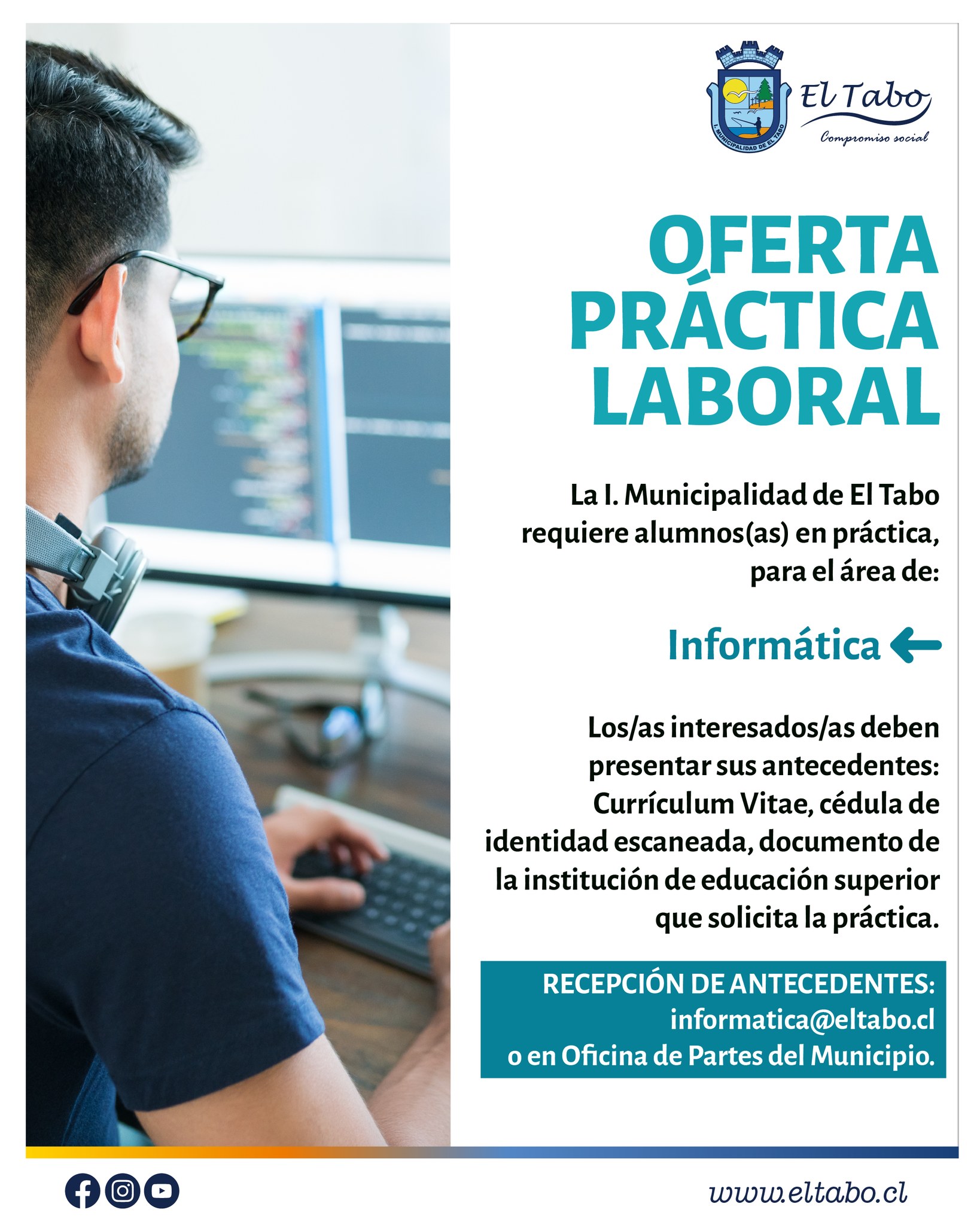 La Municipalidad de El Tabo informa que se encuentran disponibles cupos de práctica profesional para estudiantes del área de Informática, quienes deseen adquirir experiencia laboral, poner en práctica sus conocimientos y aportar al trabajo que se desarrolla al interior del municipio.
