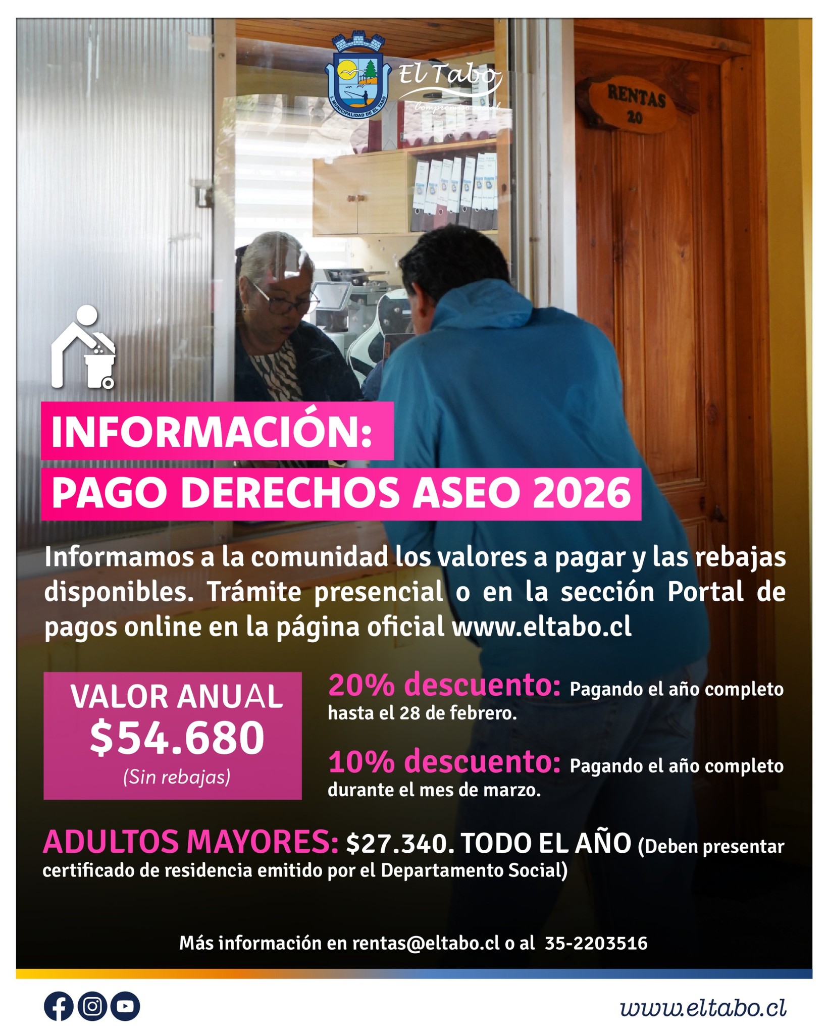 La Ilustre Municipalidad de El Tabo informa a la comunidad que quienes realicen el pago anual de los derechos de aseo durante los primeros meses del año podrán acceder a importantes descuentos establecidos para el período 2026.