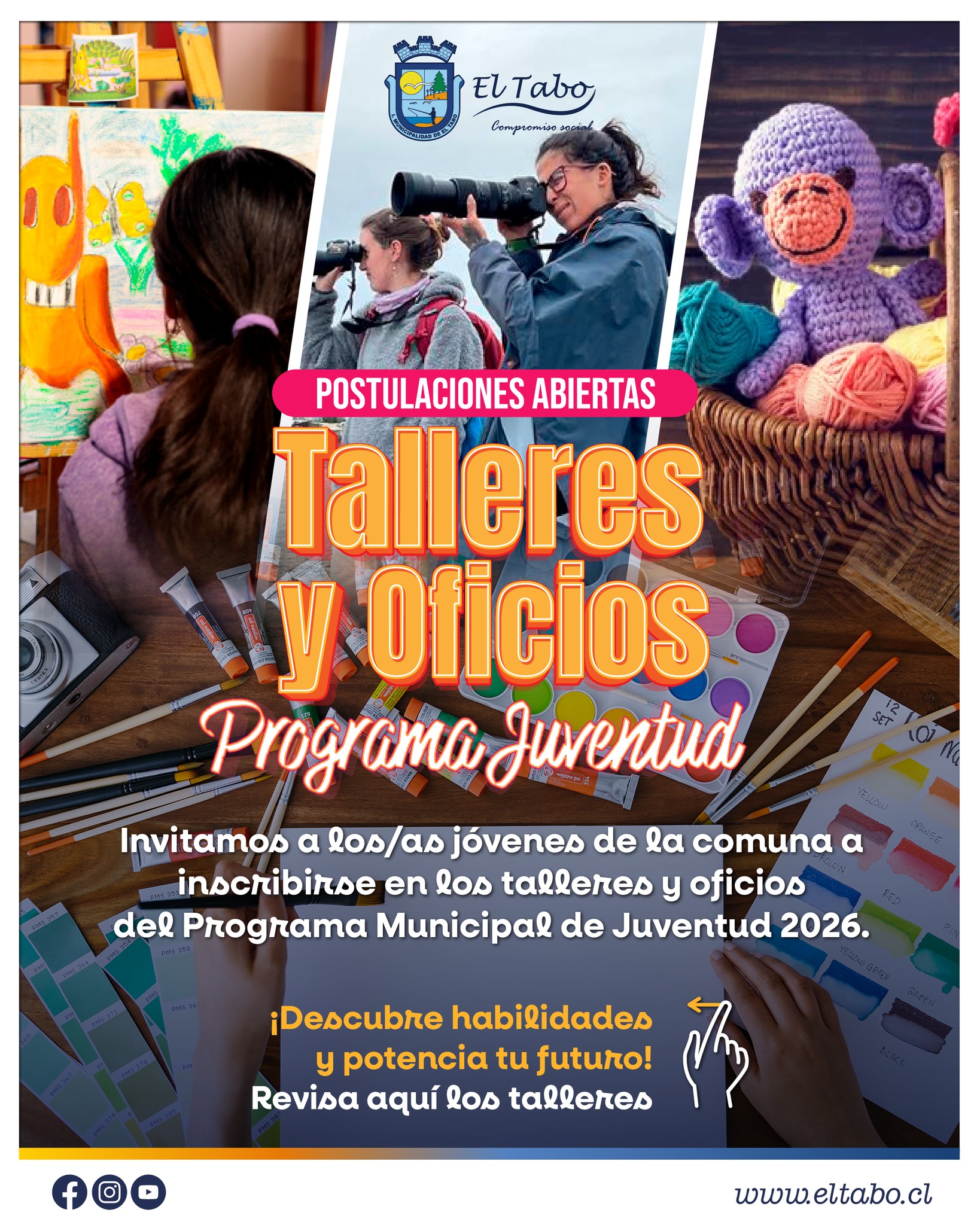 El Programa de Juventud es una iniciativa municipal que forma parte del Departamento de Niñez y Juventud, dependiente de la Dirección de Desarrollo Comunitario . Estamos comprometidos con potenciar y fortalecer la inserción social de las juventudes de la comuna de El Tabo, promoviendo su desarrollo integral a través de actividades, talleres, oficios y proyectos formativos.