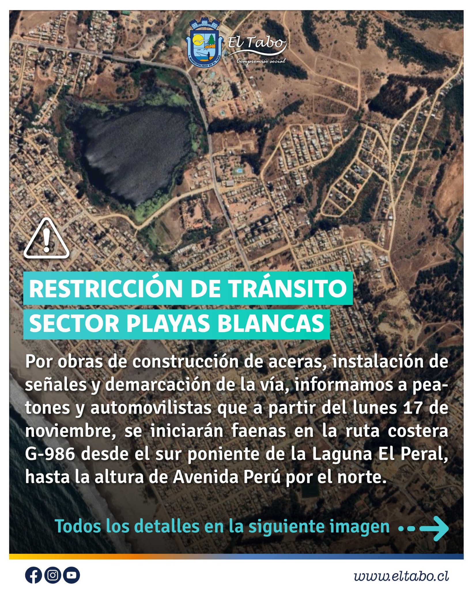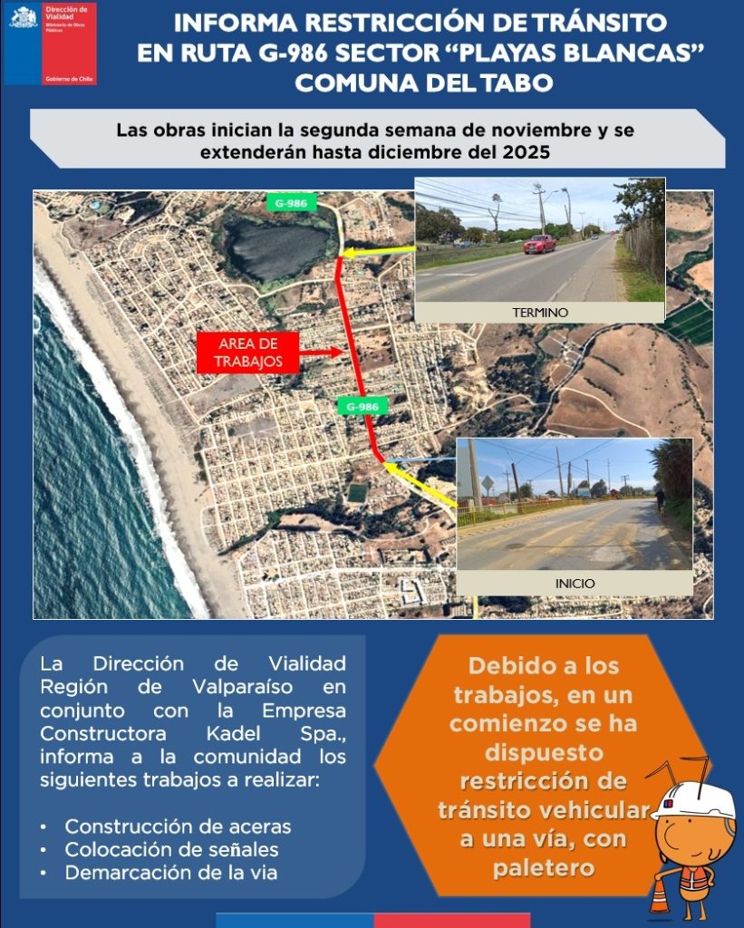 El Ministerio de Obras Públicas, a través de la Dirección de Vialidad y la empresa Constructora Kadel, iniciarán trabajos en la Ruta G-986 desde el sur poniente de la Laguna El Peral en Playas Blancas hasta Avenida Perú en la comuna de El Tabo, a partir del lunes 17 de noviembre.